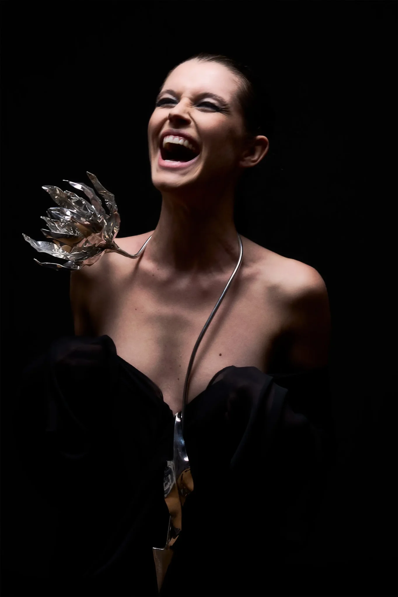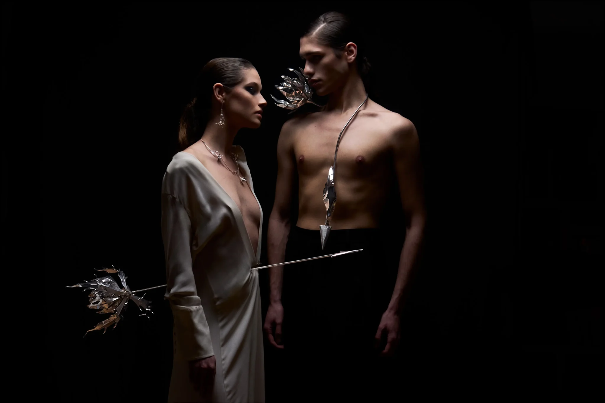 The campaign moves away from traditional jewelry, presenting three stainless steel sculptures that incorporate the arrow symbol, an emblem of martyrdom and resistance, alongside thistles that pay homage to a family legacy. The pieces are revealed on a day rich in symbolism, February 14th, Valentine’s Day, inviting contemplation through the contemporary and transgressive lens of the collection.